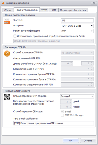 3. Создать новый профиль выпуска программных ОТР-токенов и настроить его аналогично имеющемуся, за исключением способа передачи ОТР-секрета. Его необходимо оставить с настройкой «Базовый»: