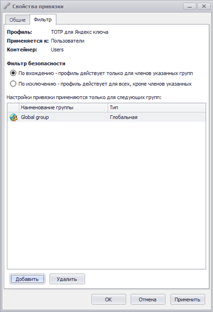 4. Привязать этот новый профиль аналогично уже имеющемуся, но с фильтрацией по ранее созданной группе (по вхождению):