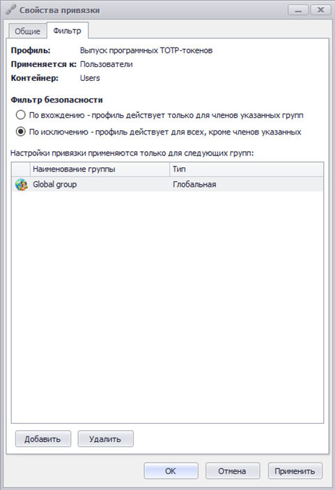 5. В настройках привязки старого профиля необходимо также добавить фильтрацию по созданной группе, но уже по исключению (для того, чтобы пользователям не создавалось лишних аутентификаторов):