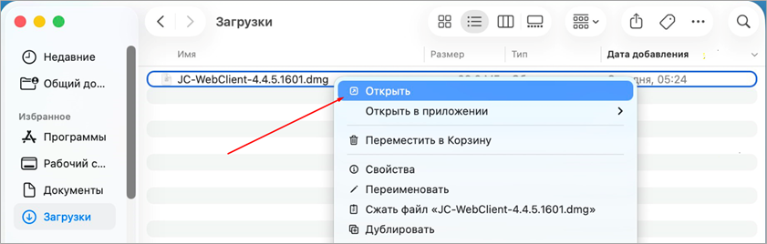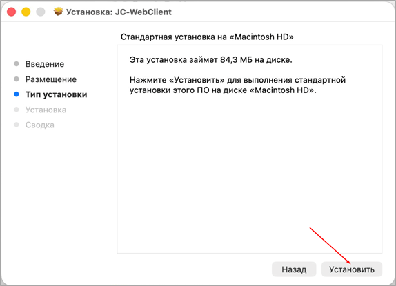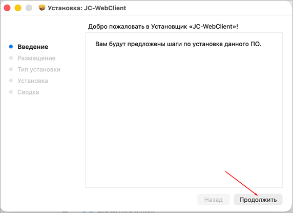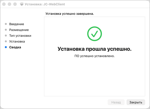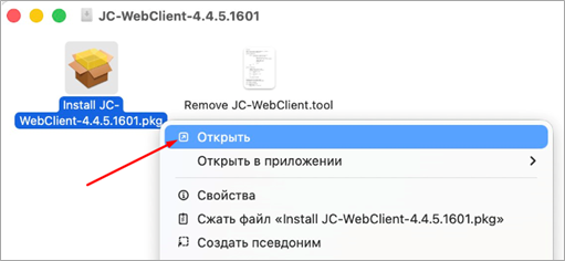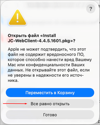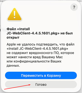 Рис. 2 5. На macOS Sequoia или выше при попытке открыть файл отобразится сообщение «Файл «JC-WebClient-4.4.5.хxxx.pkpkg» не был открыт» (Это сообщение обязательно нужно получить чтобы перейти дальше к установке). Нажать кнопку «Готово» (Рисунок 3).