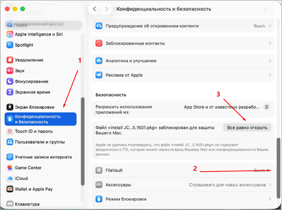 Напротив сообщения «Файл «JC-WebClient-4.4.5.хxxx.pkpkg» заблокирован для защиты вашего Mac» нажать кнопку «Все равно открыть» (Open Anyway) (Рисунок 5).