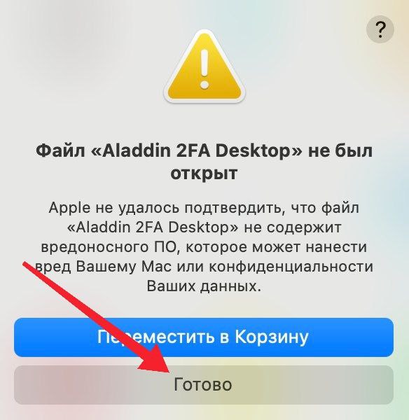 - Невозможно установить Aladdin 2FA Desktop на macOS, т.к. операционная система считает его недоверенным ПО и удаляет с рабочей станции.