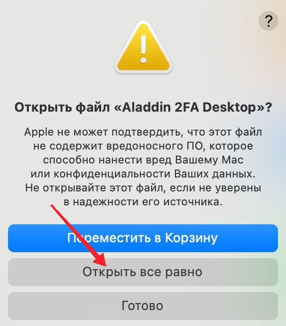 Для установки Aladdin 2FA Desktop на macOS из недоверенного источника необходимо выполнить следующие действия: