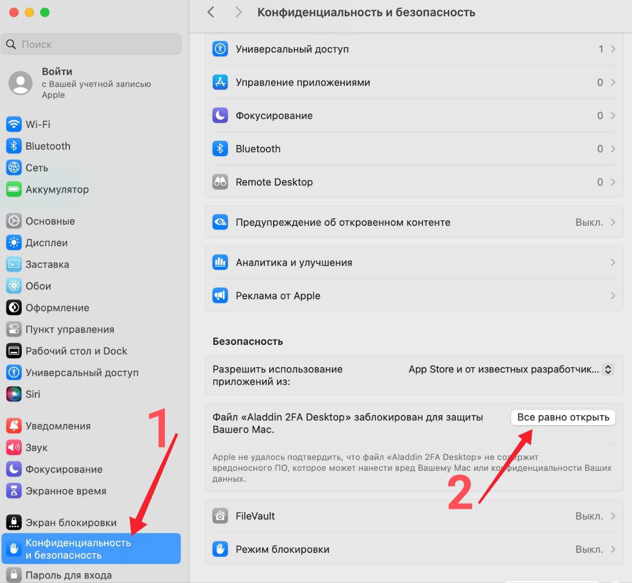 в верхнем правом углу), переходим на вкладку «Конфиденциальность и безопасность» и подтверждаем открытие файла «Aladdin 2FA Desktop» (Рисунок 4).