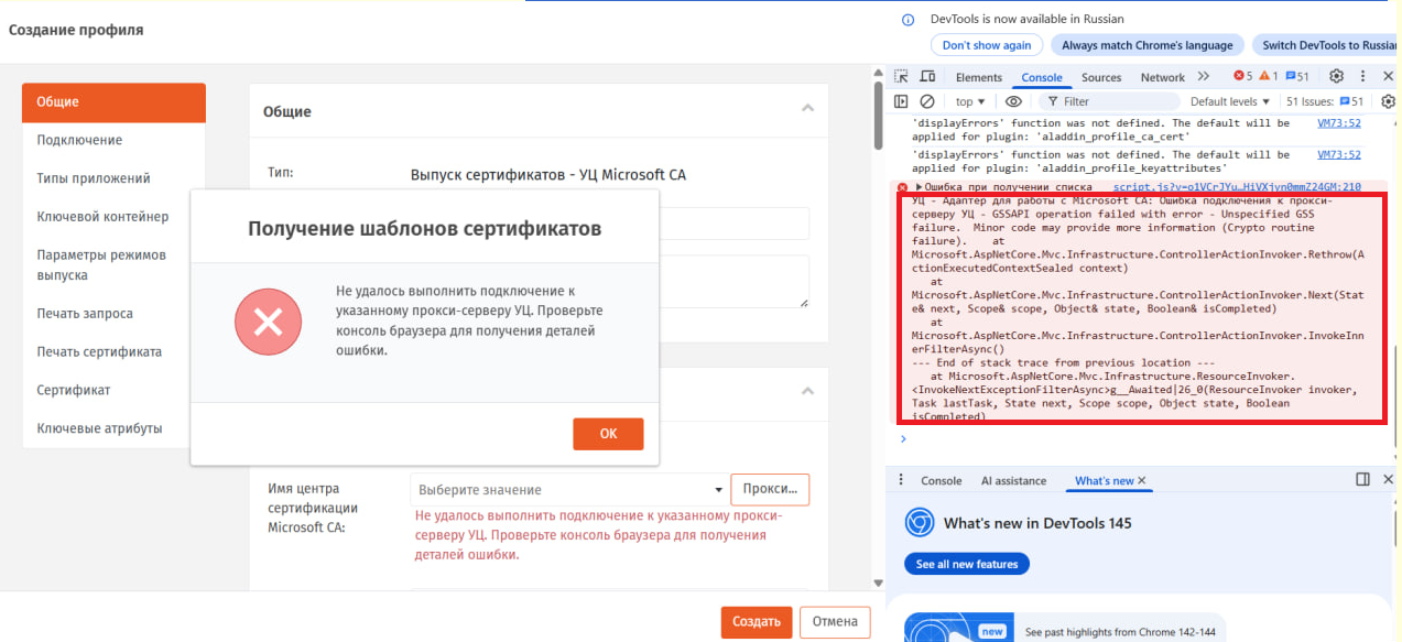 Суть проблемы: При создании профиля выпуска сертификатов через MS CA в JMS 4.1.х на RedOS 8 на этапе указания адреса CA Proxy возникает ошибка: "GSSAPI operation failed with error: Unspecified GSS failure".